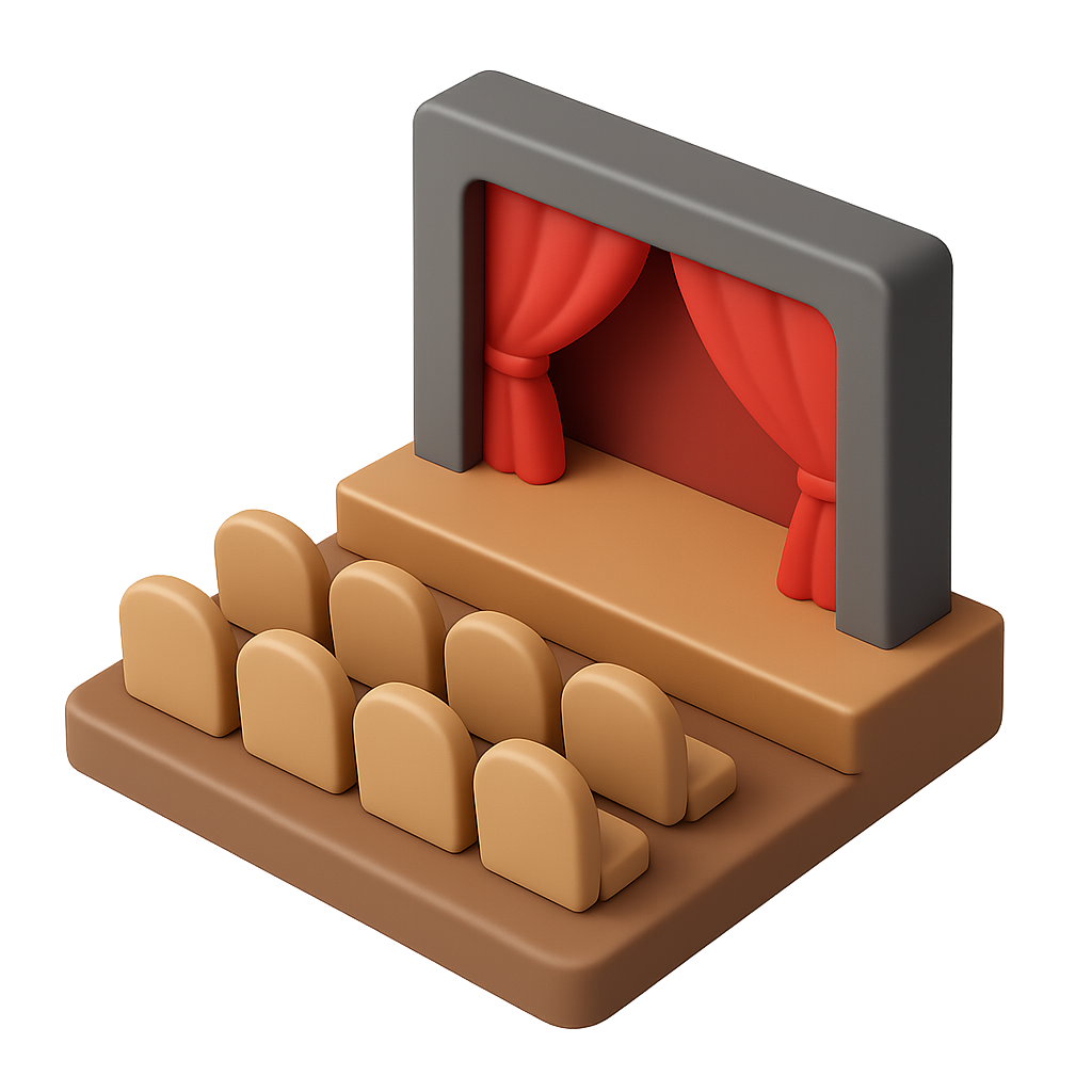 Stylized 3D Theater Icon with Seating and Curtains