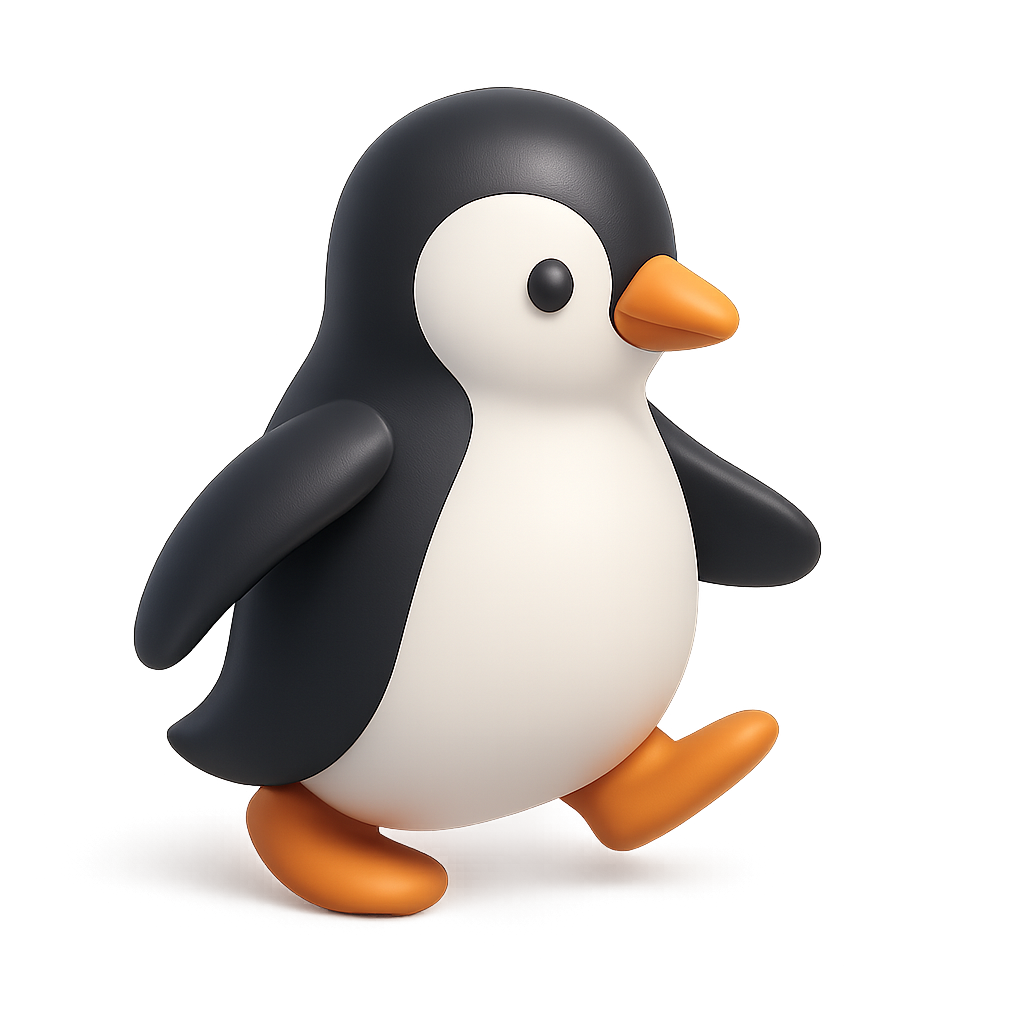 A charming 3D penguin icon in a three-quarter view, showcasing a glossy finish. The penguin features a black and white body with orange feet and a beak, set against a subtle gradient background.