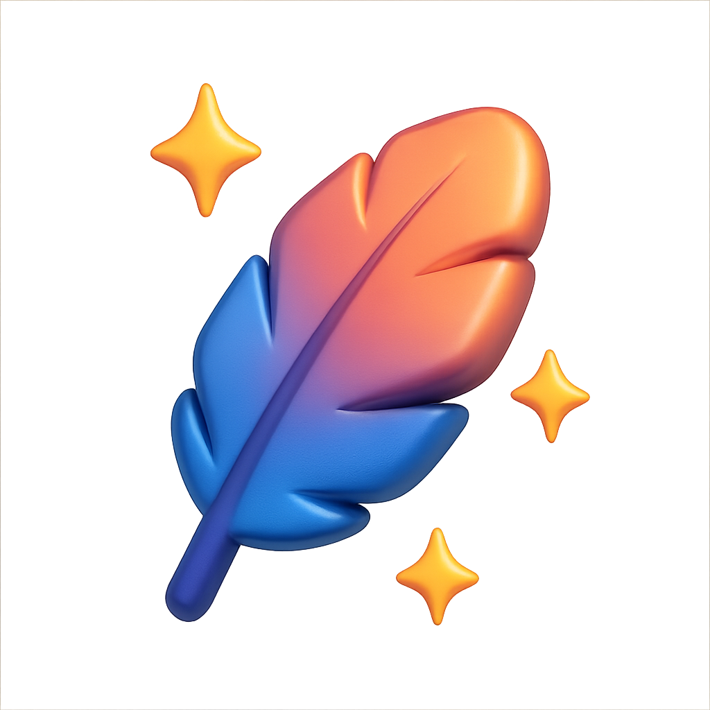 A vibrant, stylized 3D feather with a glossy finish, featuring sparkles around it. The feather is shown in a three-quarter view, emphasizing its volumetric design against a soft gradient background.