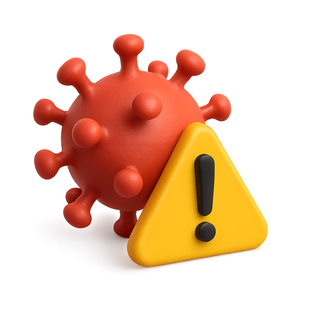 A 3D representation of a virus icon, featuring a bright red virus with protrusions and a yellow warning sign, set against a gradient background for depth.