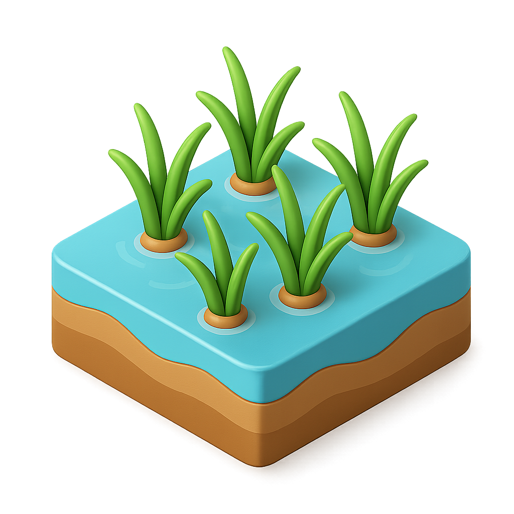A stylized 3D icon depicting a flooded rice paddy with vibrant green grass blades emerging from a blue water surface, set against a soft gradient background.