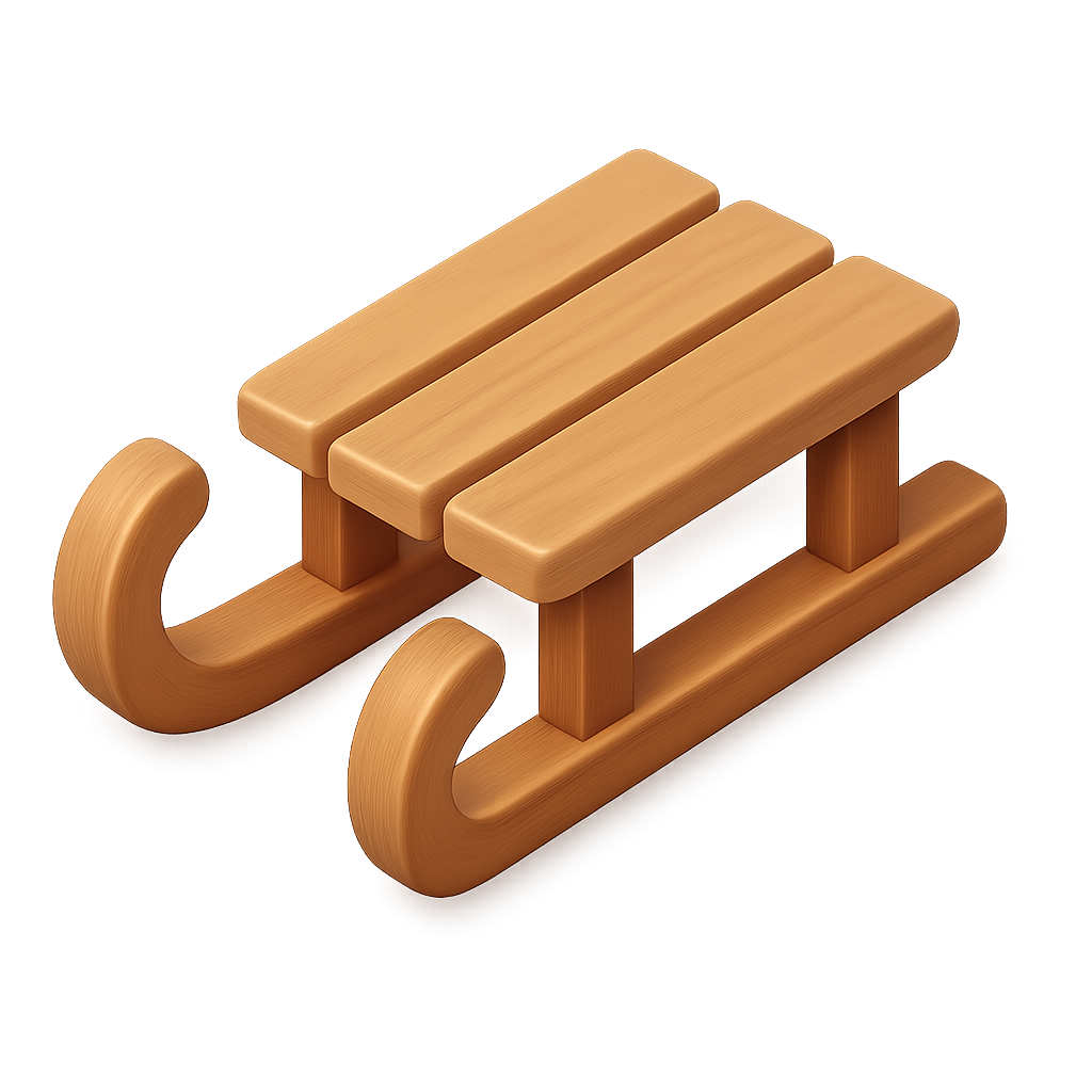A 3D representation of a wooden sledge with curved runners, designed in an isometric perspective. The icon features a smooth texture and a warm color palette, ideal for digital use.