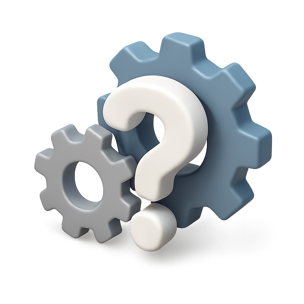 /Collection: /by davooda/Type: PNG/A 3D representation of two interlocking gears accompanied by a large question mark, designed in a three-quarter view. The gears feature a soft blue color palette, set against a subtle gradient background, enhancing the volumetric feel.