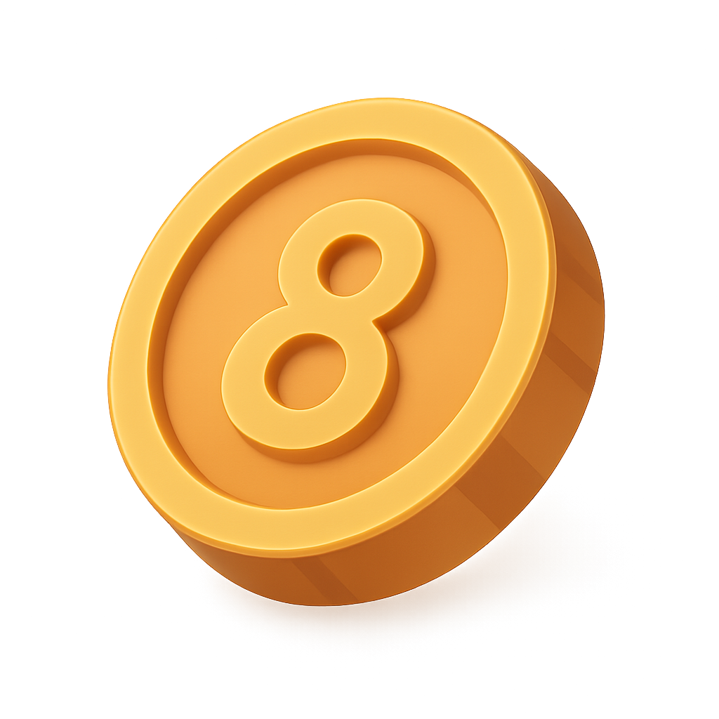 A vibrant 3D icon of a coin featuring the number eight. The coin is designed with a glossy finish and illuminated edges, showcasing an isometric view against a soft gradient background.