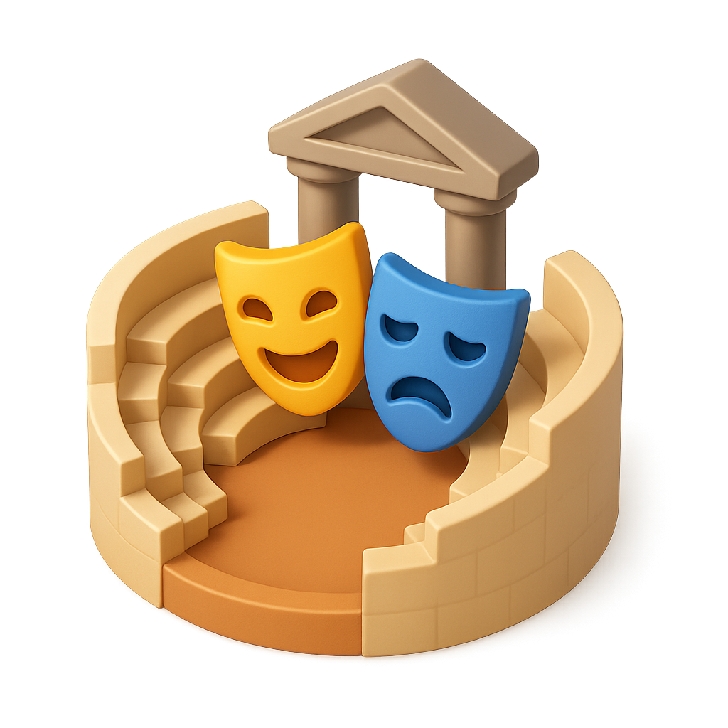 3D Greek Theater Icon with Comedy and Tragedy Masks