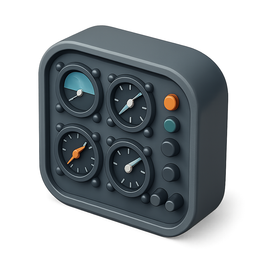 /Collection: /by davooda/Type: PNG/A three-dimensional icon of a cockpit instrument panel, featuring four gauges and control knobs. The design is isometric with a transparent background, enhancing its volumetric appearance.