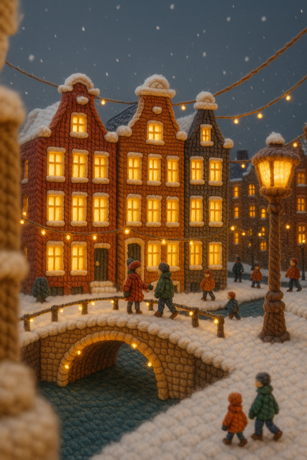 A whimsical 3D scene of Amsterdam featuring yarn-like buildings and snowy streets, adorned with warm lights and a festive atmosphere, capturing small figures enjoying the winter wonderland.