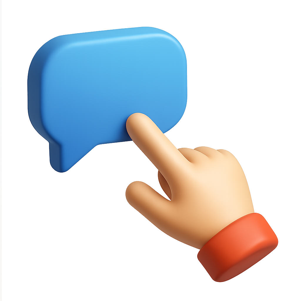 A visually appealing 3D icon featuring a hand pointing at a blue speech bubble. The design showcases isometric and volumetric elements with a transparent background.
