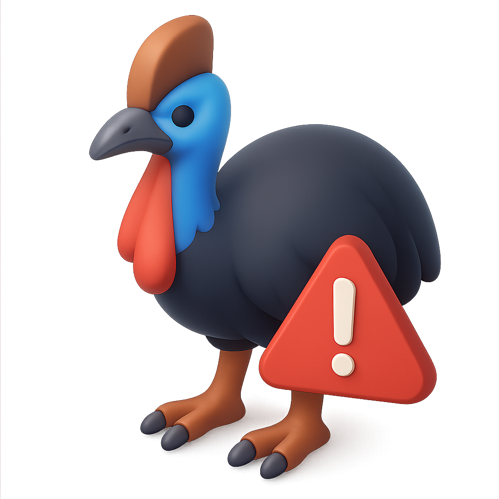 A colorful 3D icon of a cassowary featuring a warning sign. The bird is depicted in a three-quarter view, emphasizing its unique features and vibrant colors against a soft background.