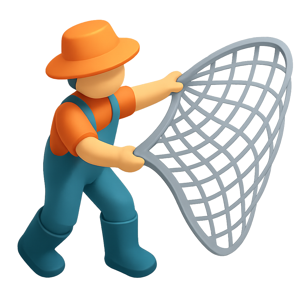 /Collection: /by davooda/Type: PNG/A 3D icon depicting a fisherman in an isometric view, casting a net. The figure wears an orange hat and shirt, with blue overalls and boots, set against a transparent background.
