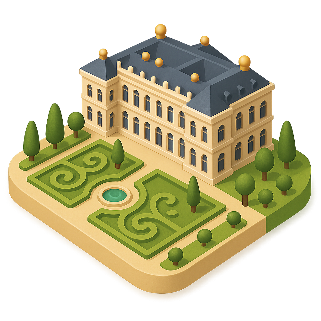 A stylized 3D icon representing the gardens of Versailles Palace, featuring a manicured layout with geometric patterns, surrounded by trees and a central fountain.
