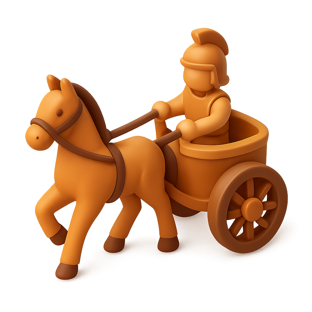 A stylized 3D icon of a war chariot featuring a charioteer and a horse. The design has a warm color palette and a three-quarter view for a dynamic look.