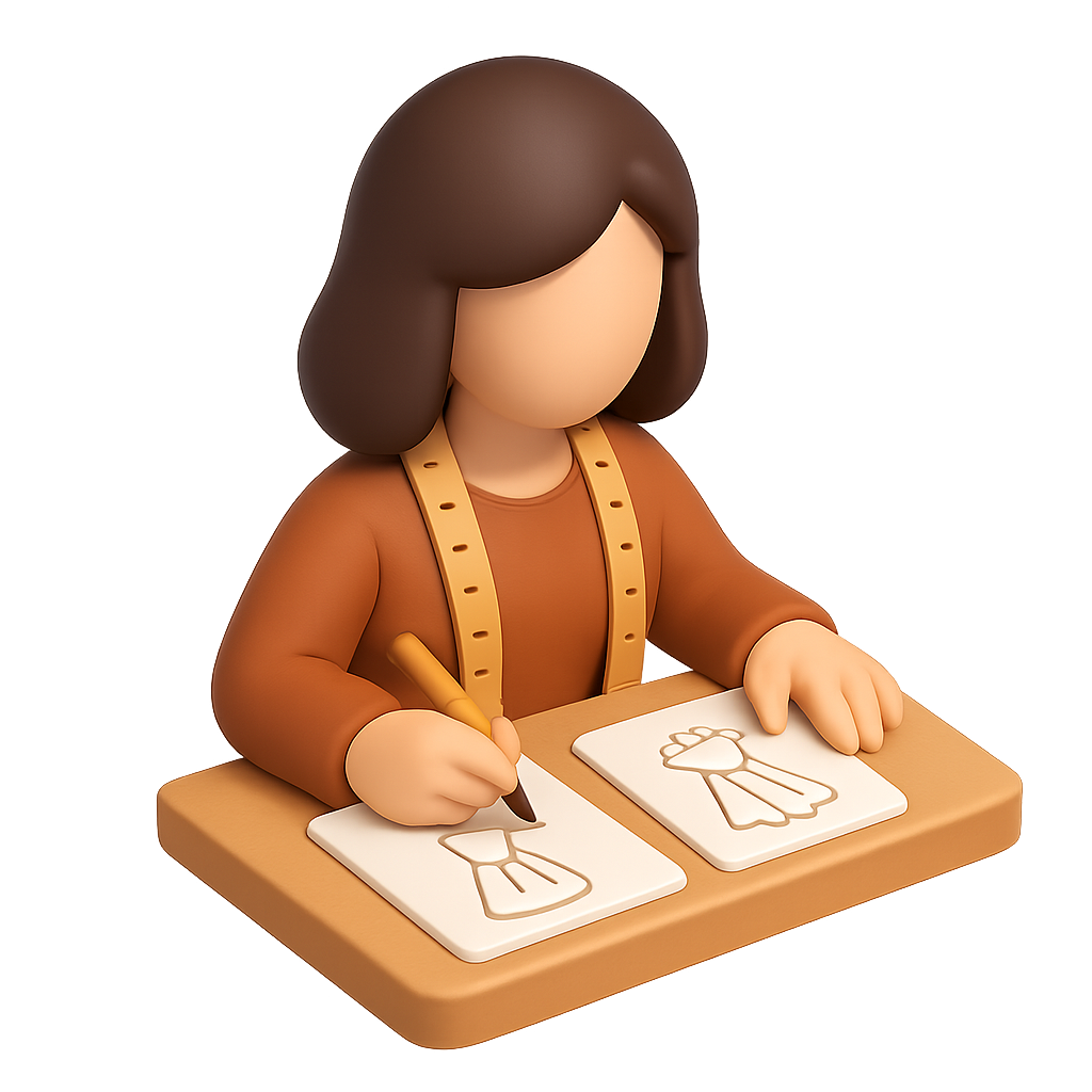 A 3D icon depicting a costume designer focused on sketching dress designs. The figure features a minimalist style, emphasizing creativity and artistry.