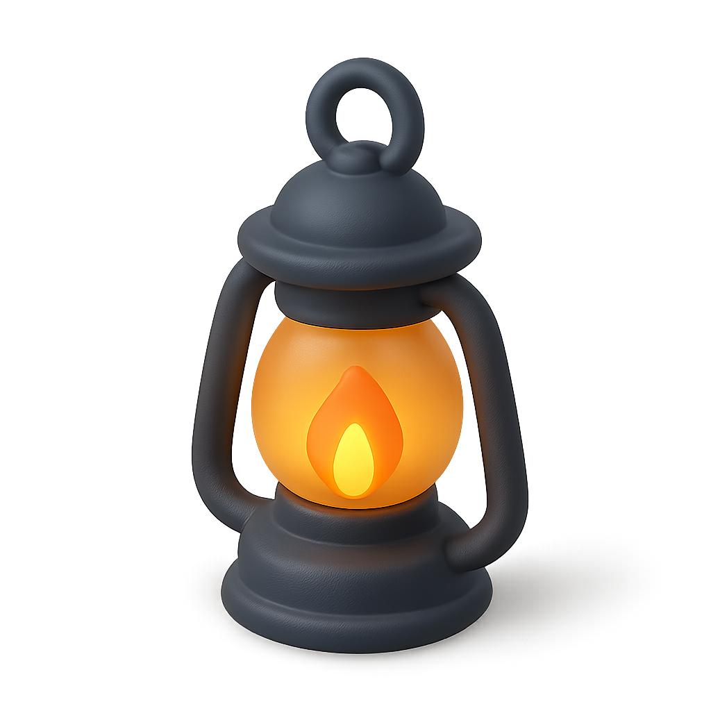 /Collection: /by davooda/Type: PNG/A stylized 3D icon of a lantern featuring a glowing flame. The lantern has a sleek design with a transparent background, presented in a three-quarter isometric view, enhancing its volumetric appearance.