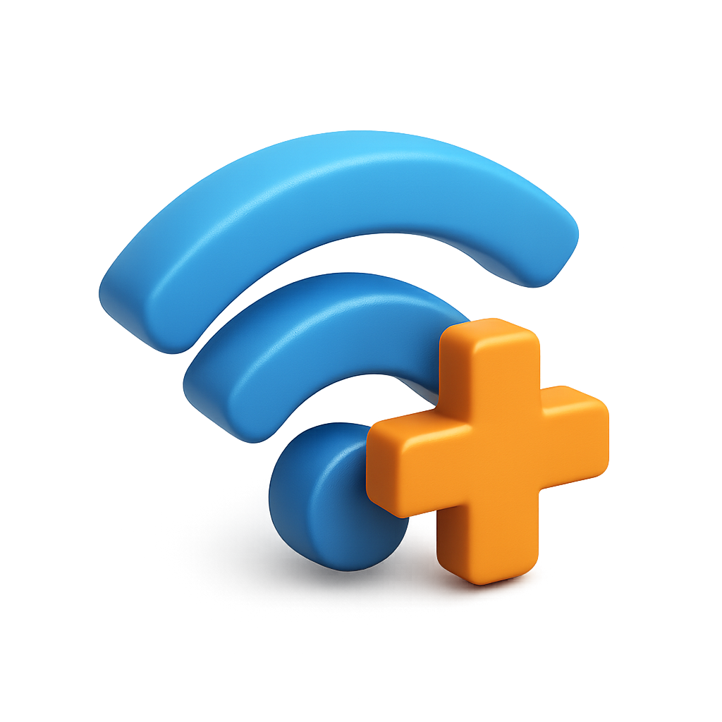 /Collection: /by davooda/Type: PNG/A vibrant 3D isometric icon featuring two curved blue lines representing a Wi-Fi signal, complemented by an orange plus sign, all set against a subtle gradient background.