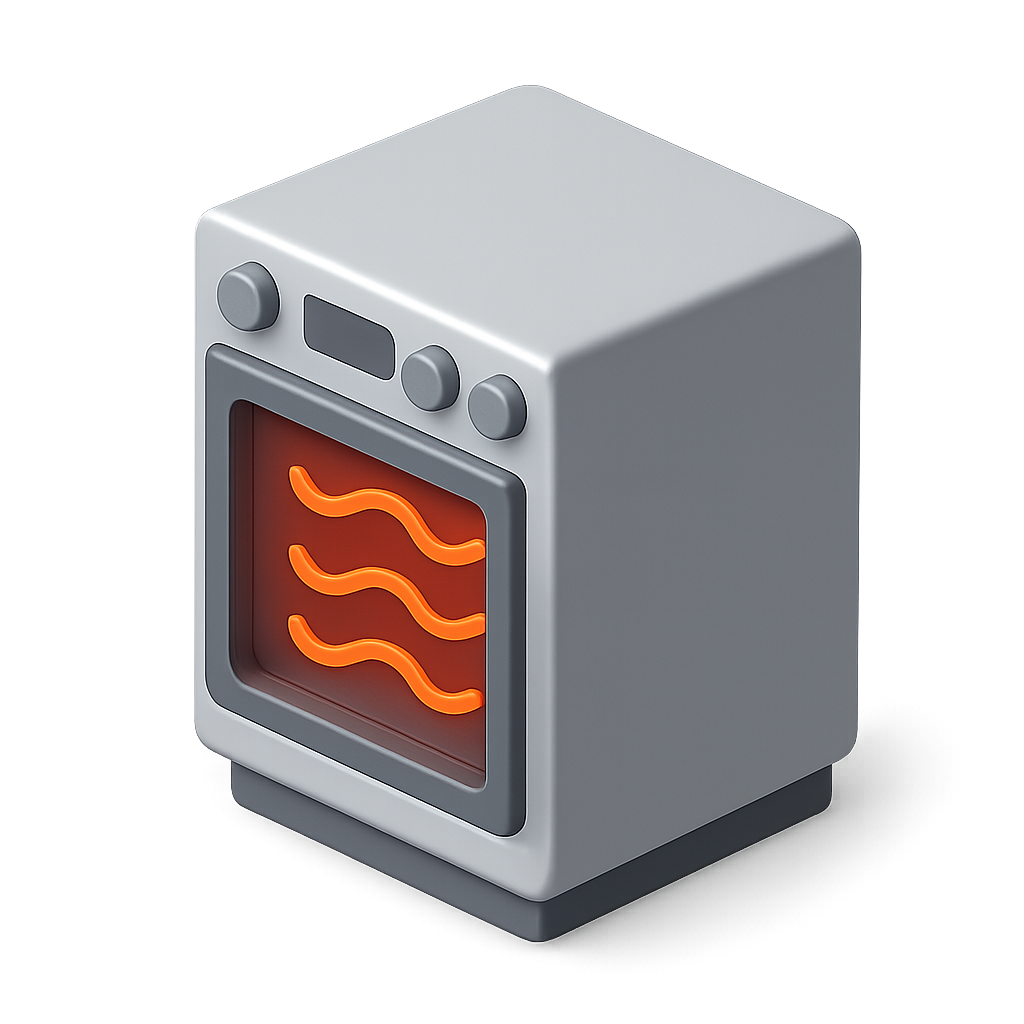 A sleek 3D icon of a kitchen oven viewed from a three-quarter angle, featuring heat lines glowing in orange, designed with a modern isometric style.