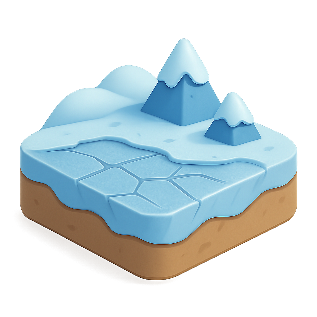 A visually appealing 3D icon depicting a frozen tundra landscape with two snowy peaks and a textured icy surface, all rendered in an isometric view.
