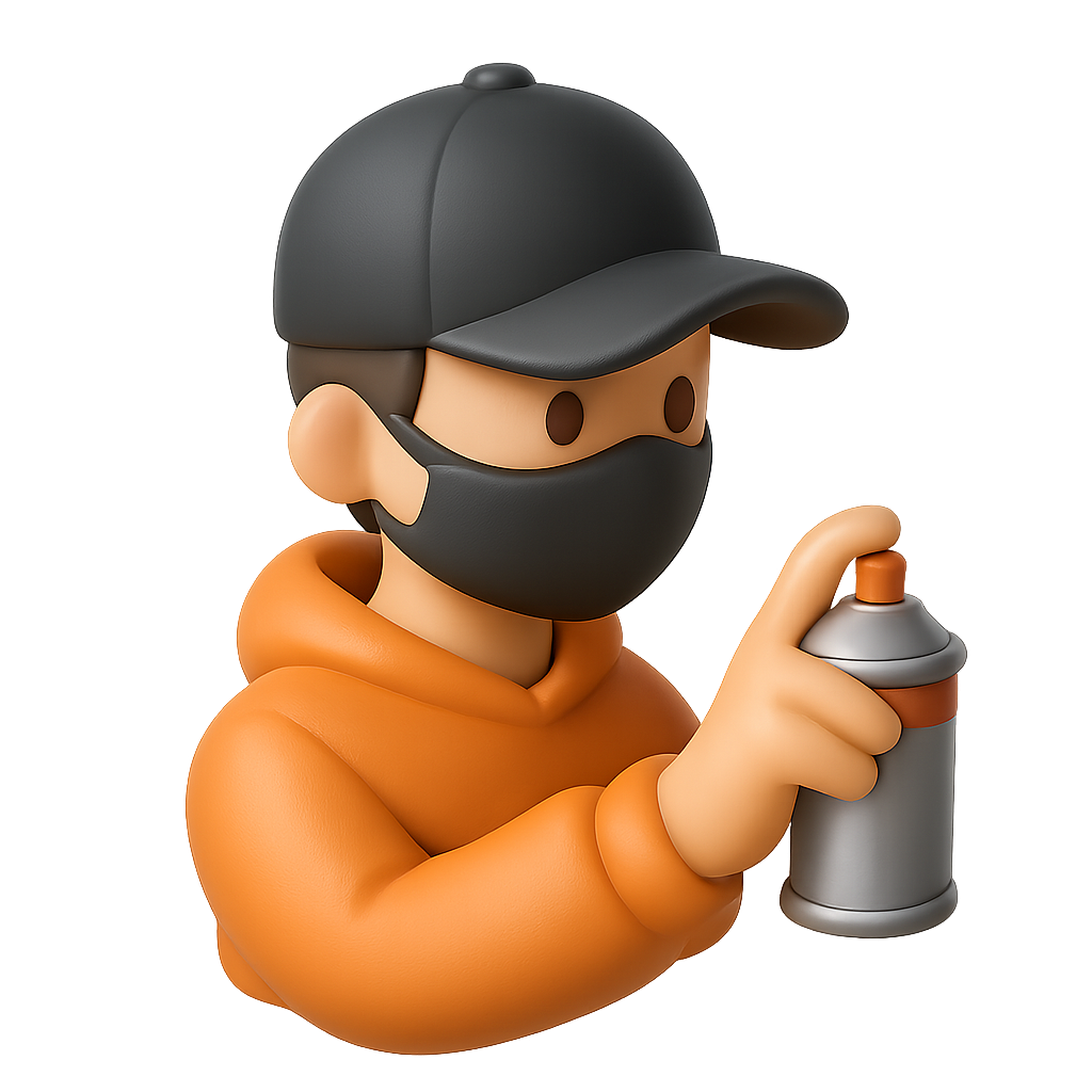 A vibrant 3D icon of a graffiti artist wearing a cap and mask, holding a spray can. The character is depicted in a three-quarter view against a soft gradient background.