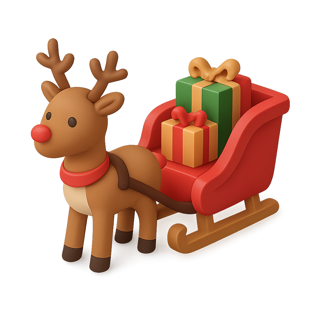 /Collection: /by davooda/Type: PNG/A charming 3D icon depicting a reindeer pulling a sleigh filled with colorful gifts. The design features a warm, inviting color palette and a three-quarter isometric perspective.
