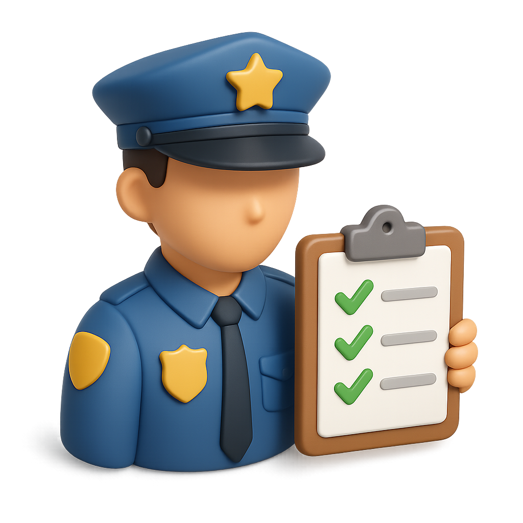 Stylized 3D Police Icon with Checklist in Isometric View