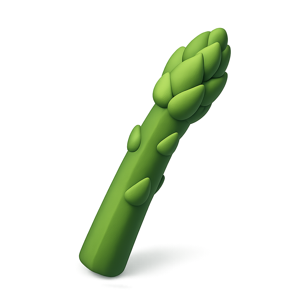 A vibrant 3D illustration of an asparagus spear depicted from a three-quarter view, featuring a smooth and glossy texture with a volumetric feel against a soft green background.