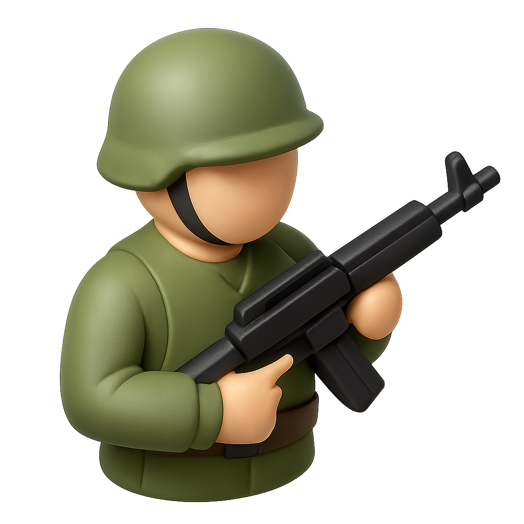 A stylized 3D soldier figure holding a rifle, depicted in a three-quarter isometric view. The character features a green uniform and helmet, set against a soft gradient background.