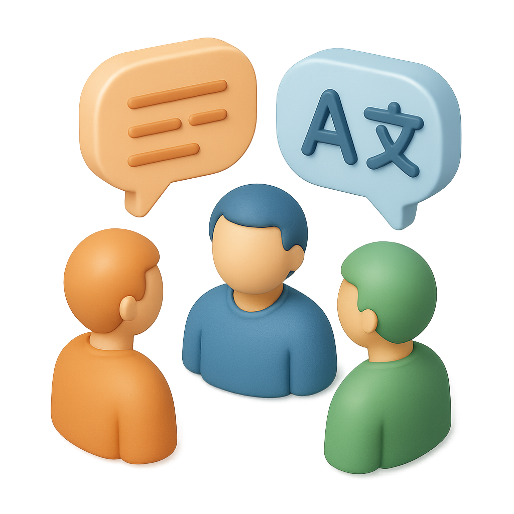 /Collection: /by davooda/Type: PNG/A visually striking 3D icon depicting four figures engaged in a language discussion, featuring speech bubbles with text elements. The icon has a transparent background and is designed in a volumetric, isometric style.