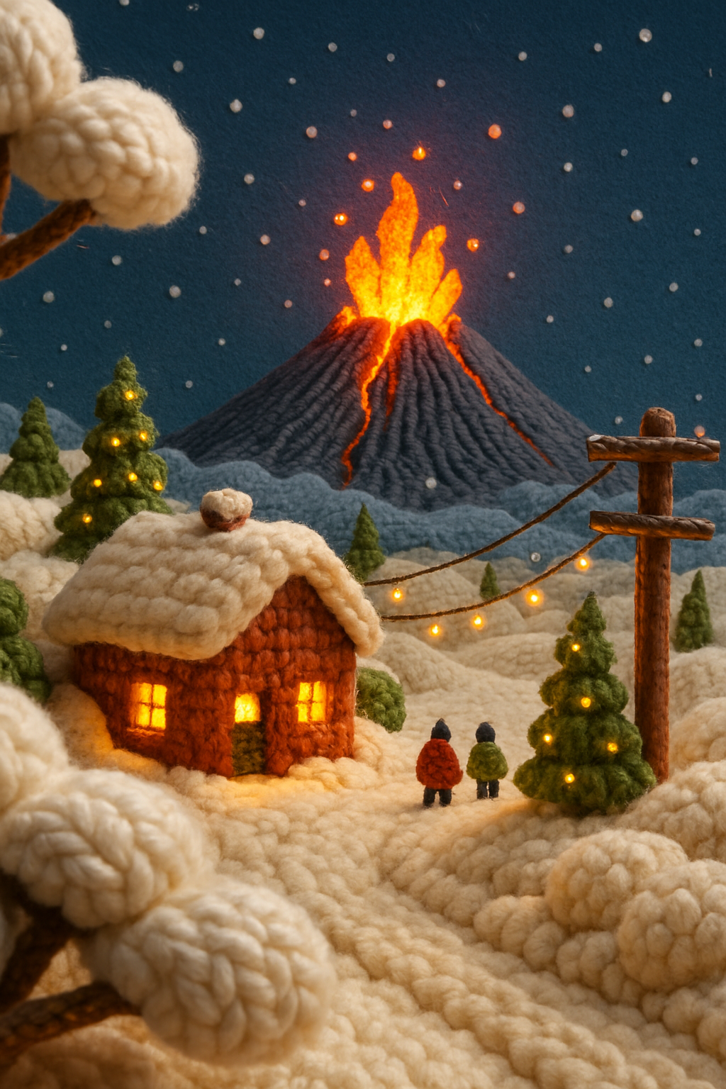 /Collection: /by davooda/Type: PNG/A charming 3D depiction of a knitted volcano in Hawaii, featuring a cozy house, snow, and tiny people. The scene is vibrant with festive colors and a serene ambiance.