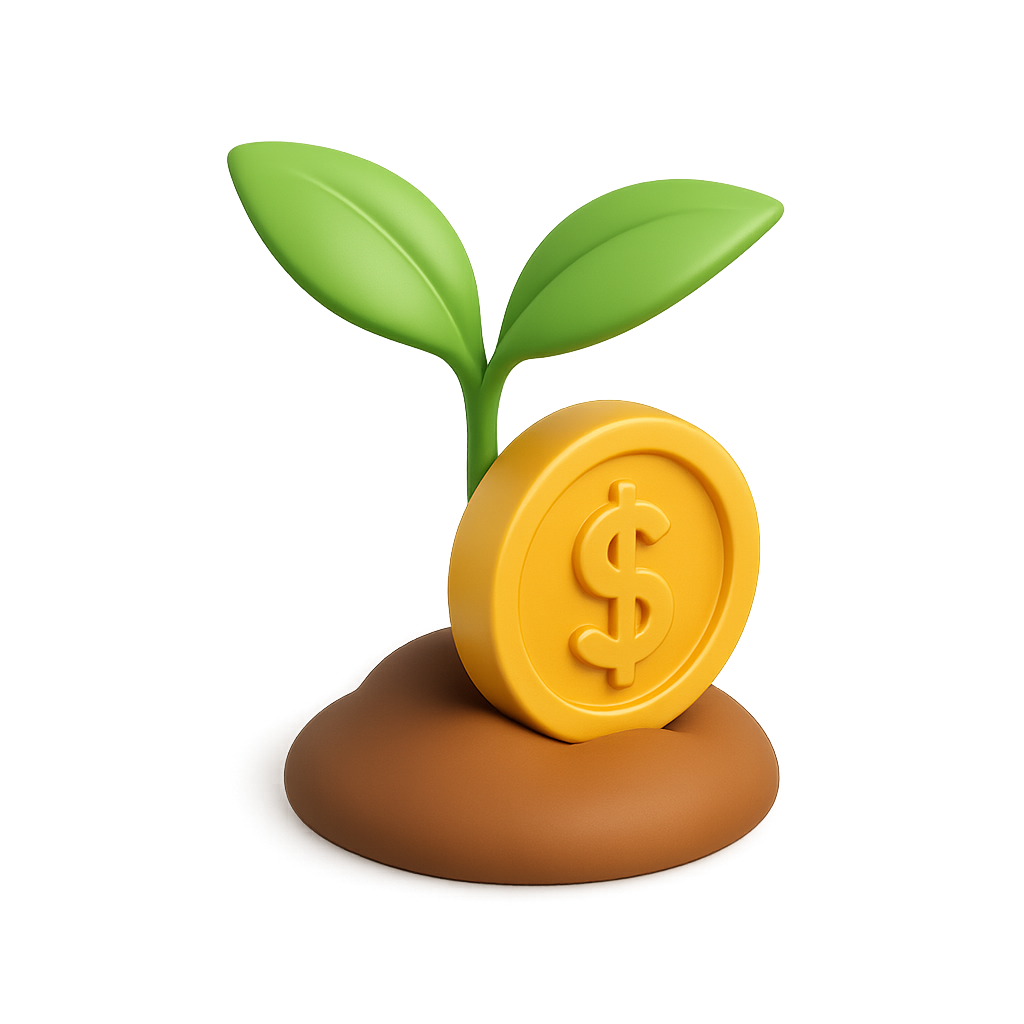 A vibrant 3D icon depicting a green plant sprouting from a brown mound of soil with a yellow money coin, symbolizing growth and prosperity.
