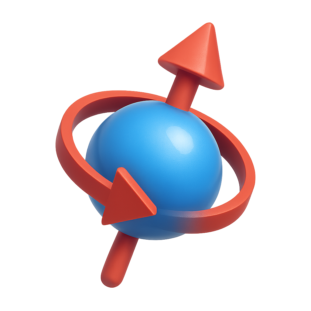 A visually striking 3D icon representing electron spin in spintronics. The design features a blue sphere with red arrows indicating rotation, set against a transparent background.
