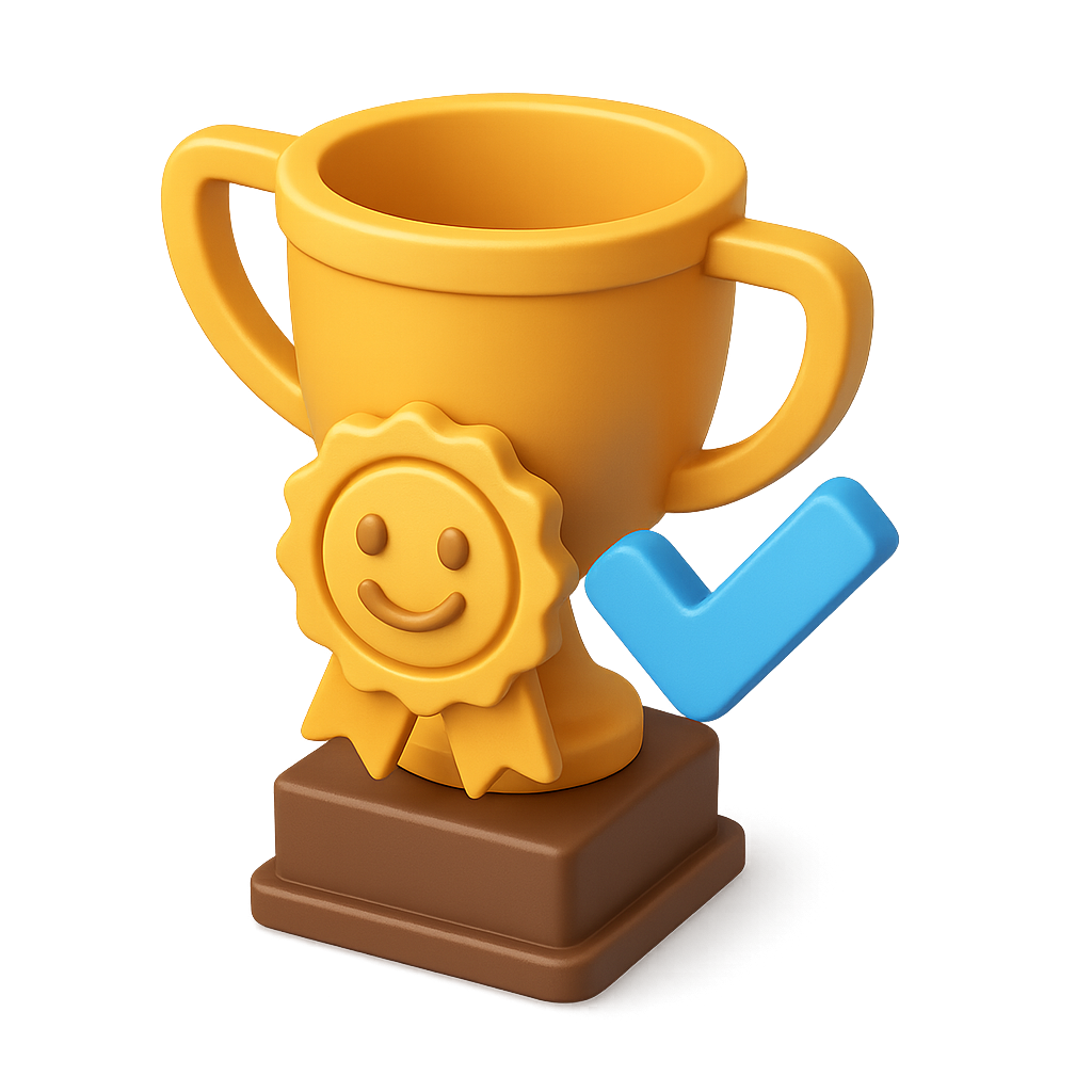 /Collection: /by davooda/Type: PNG/A vibrant 3D trophy icon featuring a smiling face emblem, symbolizing customer success. The trophy is designed in a three-quarter view with a transparent background, showcasing its volumetric and isometric qualities.