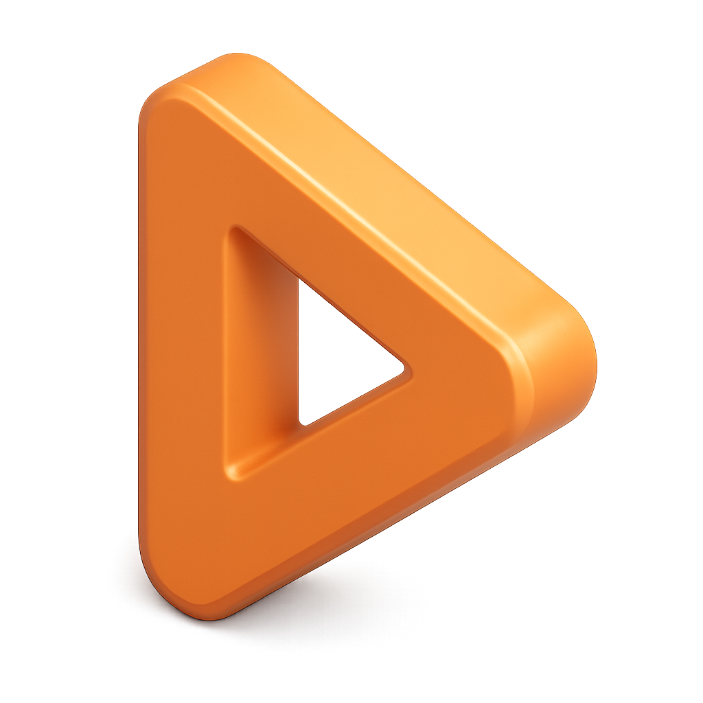 A vibrant 3D play button icon in orange, featuring a smooth, glossy finish and a three-quarter isometric view, set against a soft gradient background.