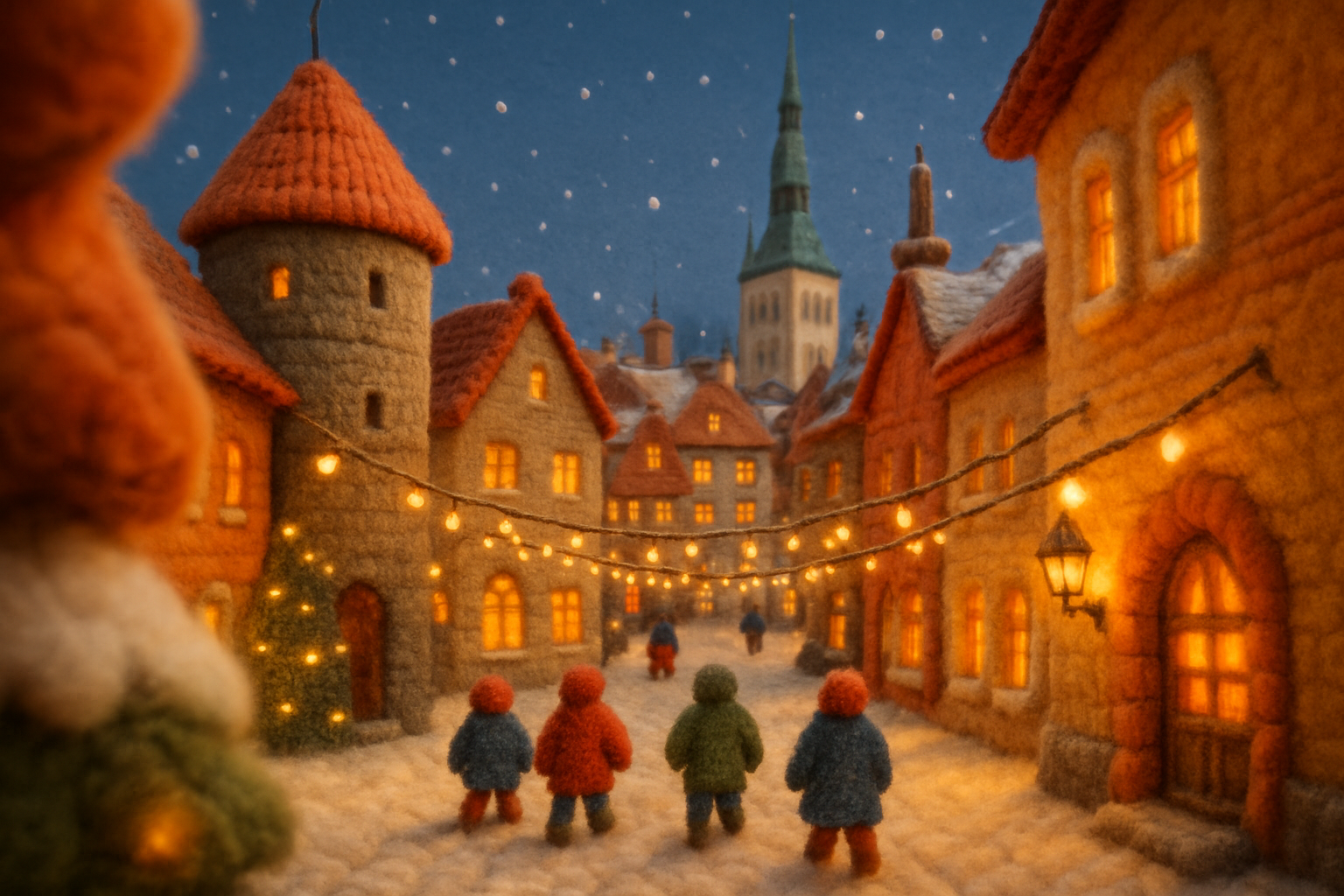 A whimsical depiction of Tallinn's old town made from wool yarn, featuring colorful buildings, soft textures, and a festive atmosphere with snow and lights.