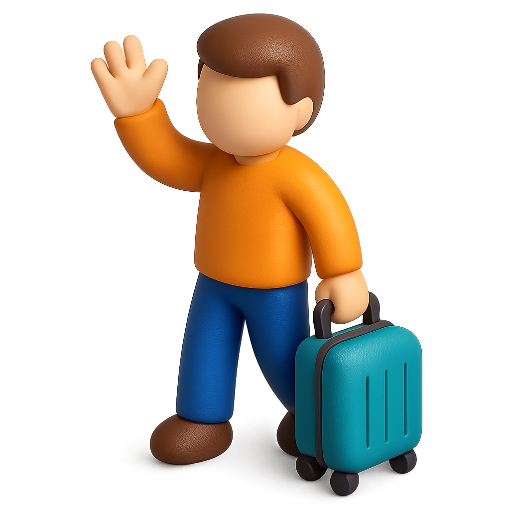 A colorful 3D icon depicting a person in an orange shirt and blue pants waving, holding a teal suitcase. The design features a three-quarter view with a volumetric feel.