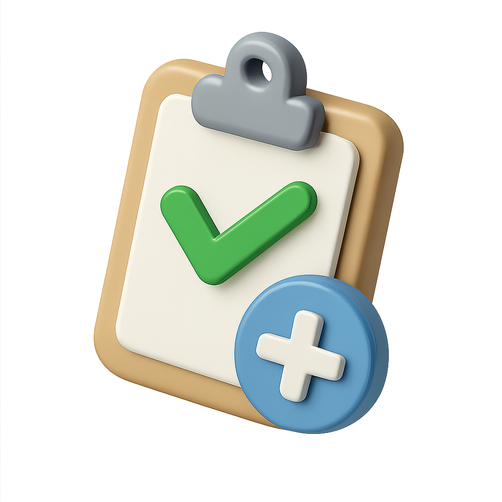 A stylized 3D icon featuring a clipboard with a green checkmark and a blue plus symbol. The design is presented in a three-quarter isometric view with a transparent background.