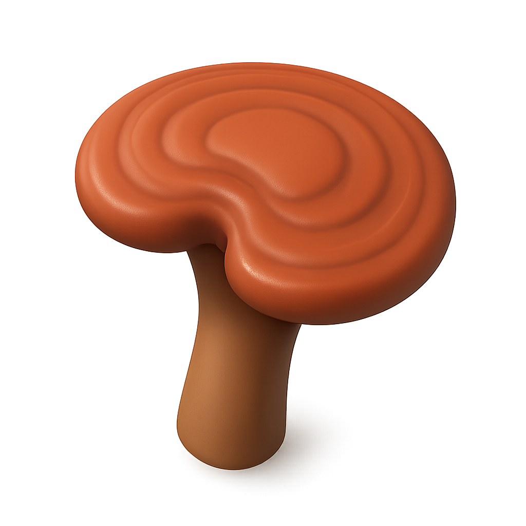 /Collection: /by davooda/Type: PNG/A stylized 3D icon of a reishi mushroom, showcasing its smooth, wavy surface and distinct shape. The design features a three-quarter view with a transparent background, emphasizing its volumetric and isometric qualities.