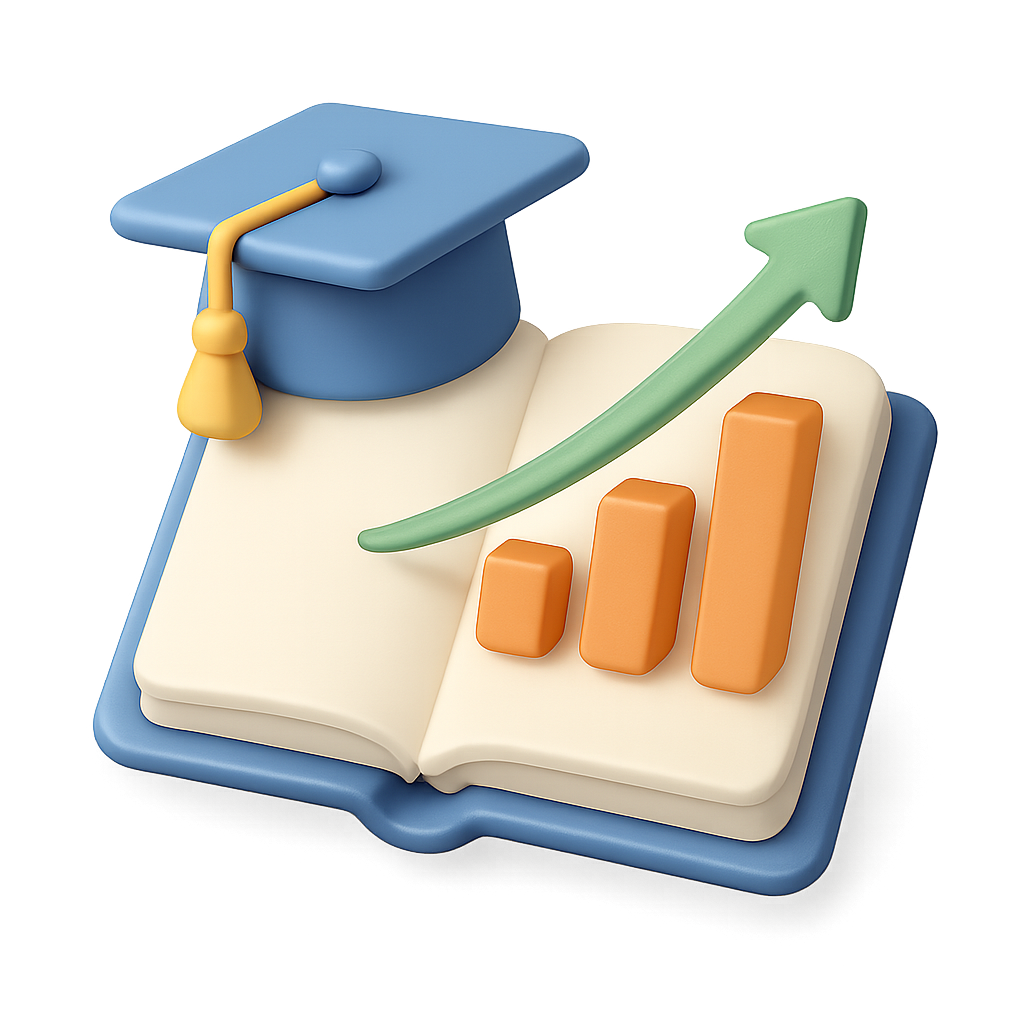 A stylized 3D icon showcasing a graduation cap, an open book, and upward growth bars, symbolizing professional development and learning.