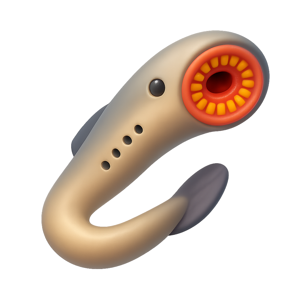 A stylized 3D icon of a lamprey, showcasing its unique features in a three-quarter view. The design includes vibrant colors and a transparent background, emphasizing its volumetric and isometric qualities.