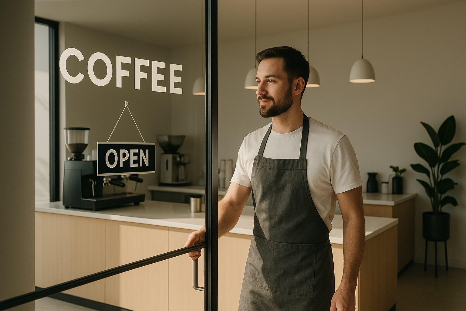 /Collection: /by davooda/Type: PNG/A barista stands at the entrance of a stylish, modern café, opening the door with an 'OPEN' sign visible. The minimalist interior features soft lighting and plants, setting a welcoming atmosphere.