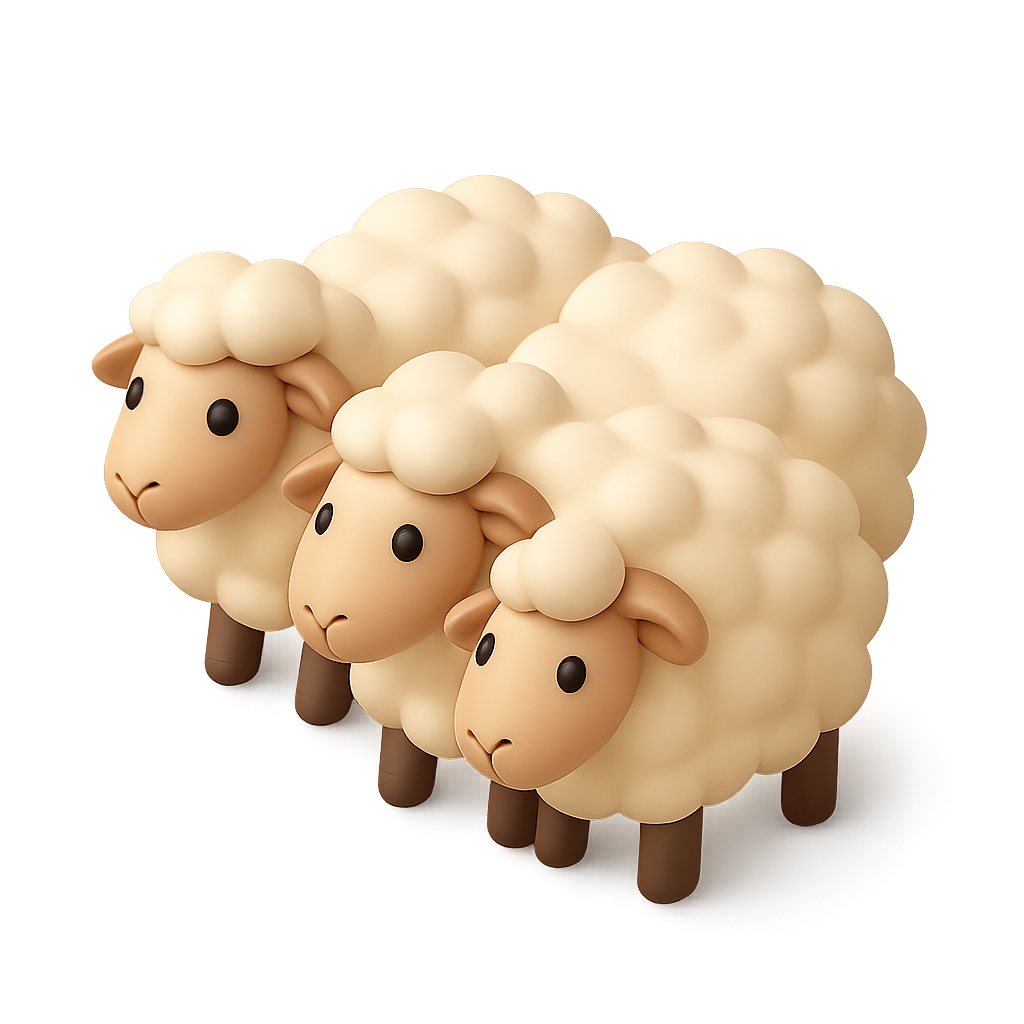 A trio of cute, stylized 3D sheep icons with fluffy wool and a soft color palette, presented in a three-quarter isometric view against a gradient background.