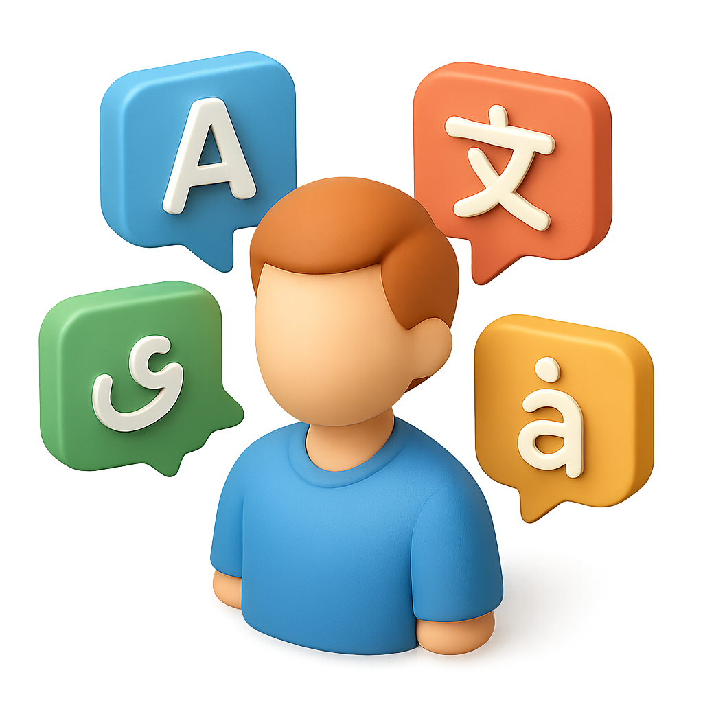 /Collection: /by davooda/Type: PNG/A 3D icon depicting a person surrounded by colorful speech bubbles with various language symbols, representing multilingual communication in a vibrant, isometric style.