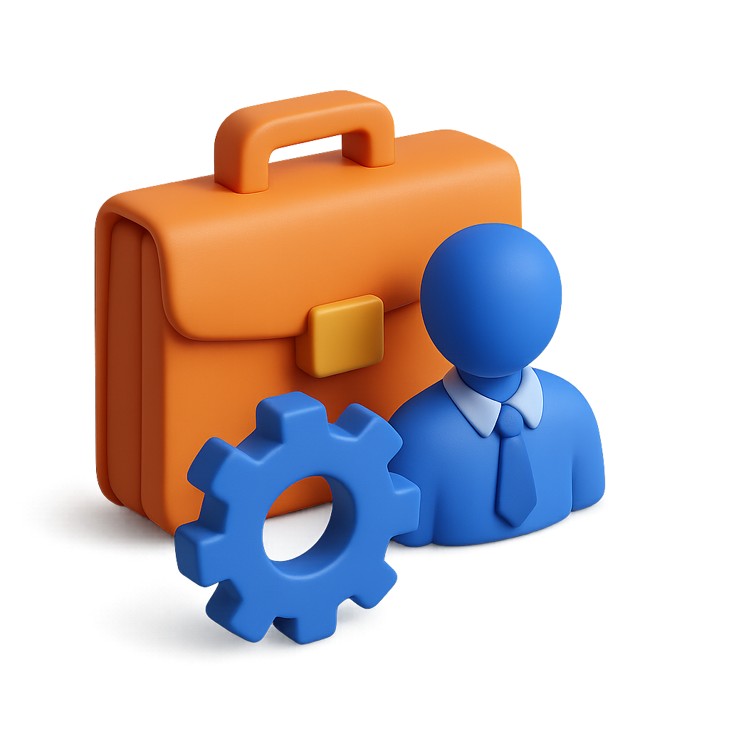 /Collection: /by davooda/Type: PNG/A visually appealing 3D icon depicting a blue figure in a suit next to an orange briefcase and a blue gear. The design showcases a modern and professional aesthetic suitable for internship themes.