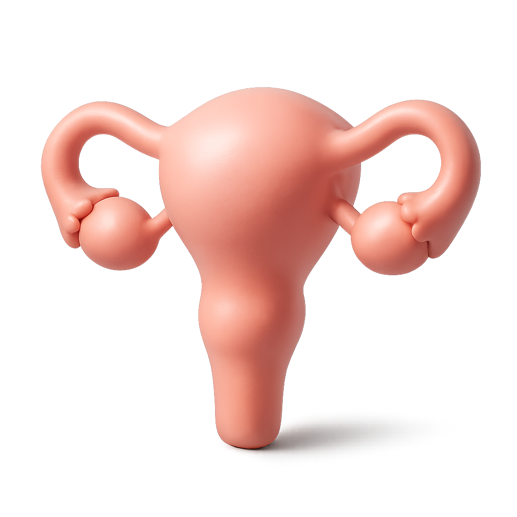 A stylized 3D representation of a uterus, showcasing a smooth, glossy finish in a three-quarter view. The design features rounded appendages, enhancing its volumetric appeal.