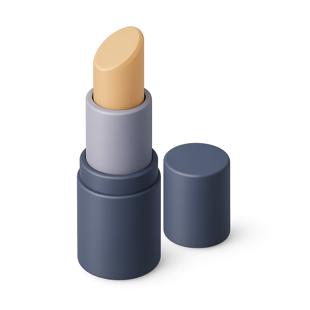 A 3D representation of a concealer stick in a three-quarter view. The design features a creamy top and a sleek casing, showcasing a modern aesthetic.