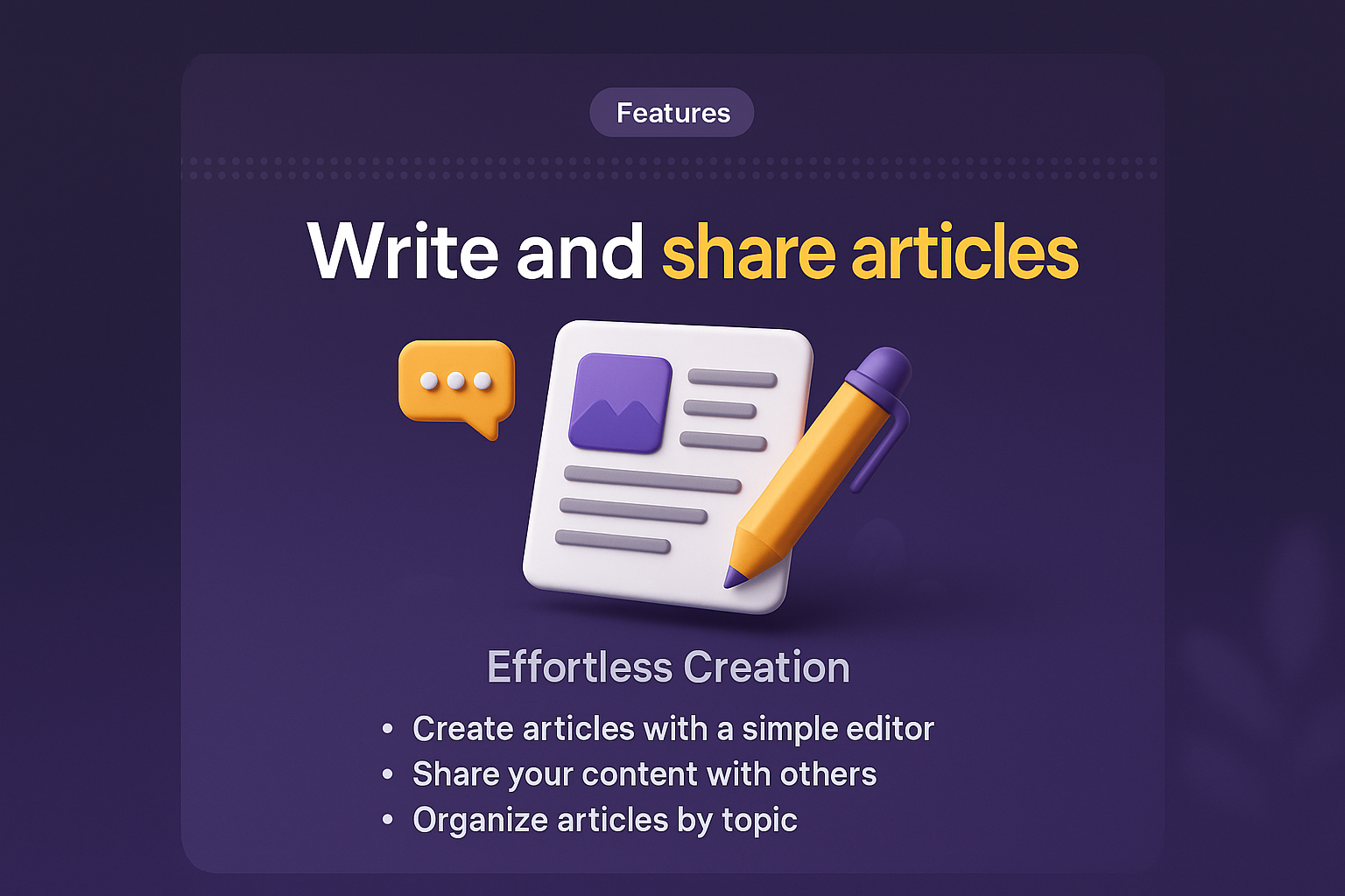 /Collection: /by davooda/Type: PNG/A visually appealing 3D illustration for a landing page that promotes article sharing features. It includes a prominent header, supporting graphics, and clear text blocks with bullet points.
