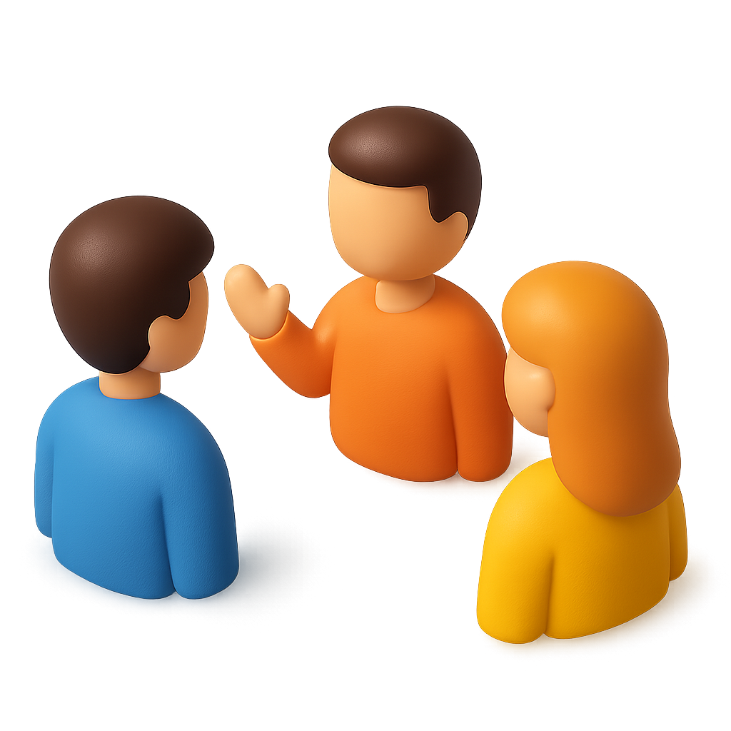 /Collection: /by davooda/Type: PNG/A 3D icon featuring three stylized characters in a group interaction. One character is gesturing, while the others listen attentively. The design is isometric with a volumetric feel, set against a soft gradient background.