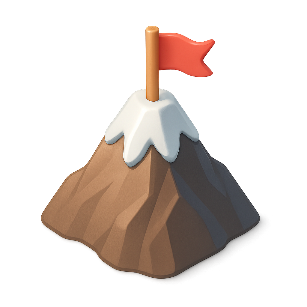 A 3D icon of a mountain peak featuring a red flag atop, with a snowy cap and textured brown slopes, presented in an isometric view against a subtle gradient background.
