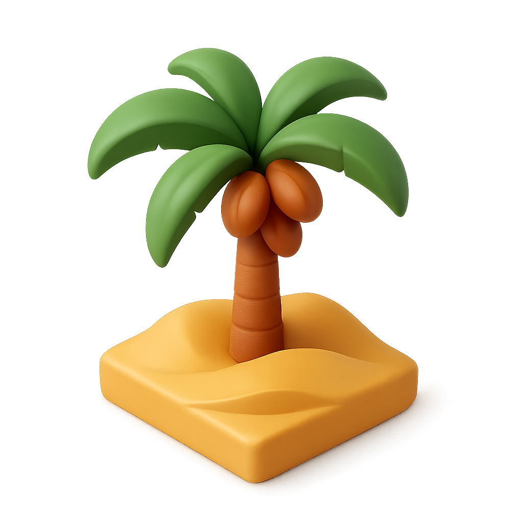/Collection: /by davooda/Type: PNG/A vibrant 3D icon of a date palm tree with green leaves and orange dates, set on a sandy base. The icon features a transparent background and an isometric view, enhancing its volumetric appearance.