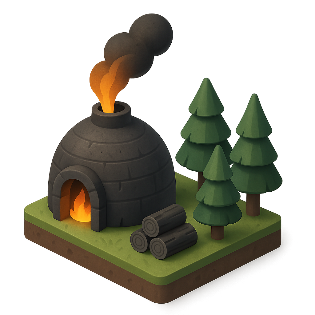 A charming 3D illustration of a charcoal burner in a forest setting, featuring a dome-shaped kiln emitting smoke, surrounded by stylized trees and logs, all on a grassy base.