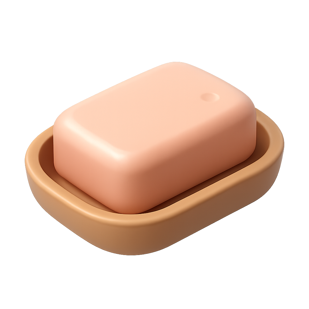 A sleek 3D representation of a soap bar resting in a dish, designed with a transparent background. The soap features a soft pink hue and a rounded shape, showcased in a three-quarter isometric view.